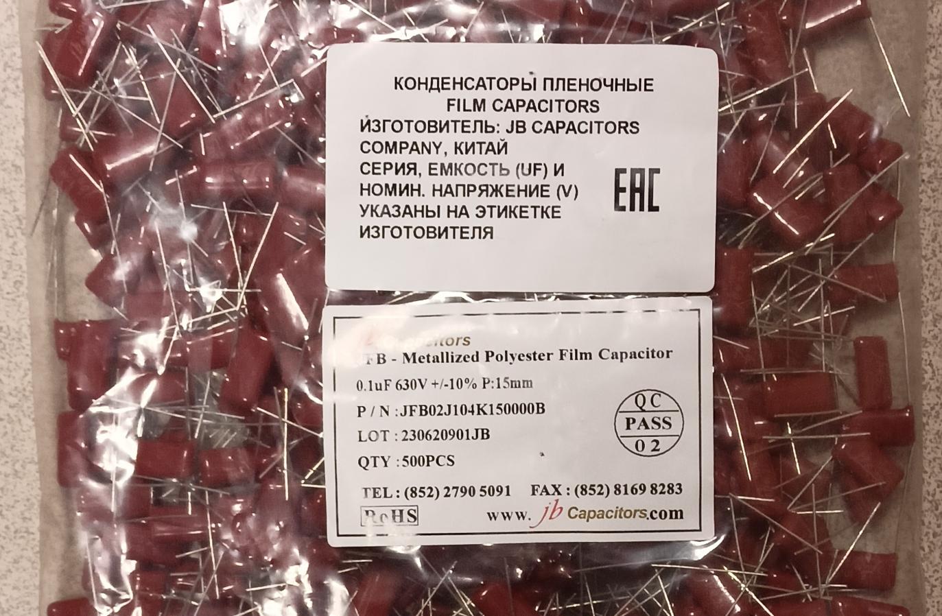 0,1uF x 630V CL21 10% P 15mm JB JFB02J104K150000B цена за 1шт при количестве 500шт