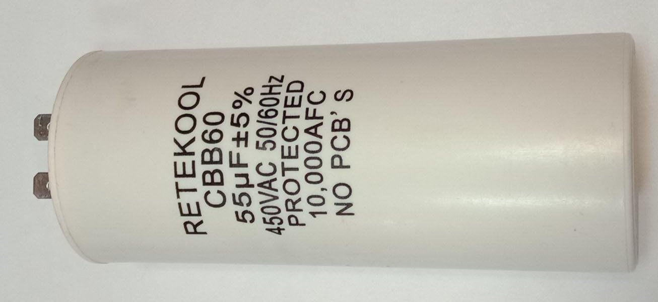 конденсатор пусковой 55uF 450V 85C 50/60Hz клеммы 50x120mm Retekool CBB60