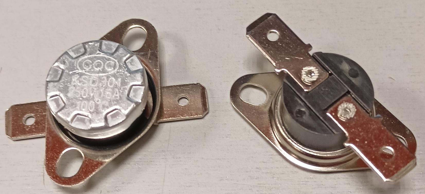термостат,KSD301,100градусов,16A,250V,2pin,нормально замкнутый,подвижный фланец, вертикальные ноги