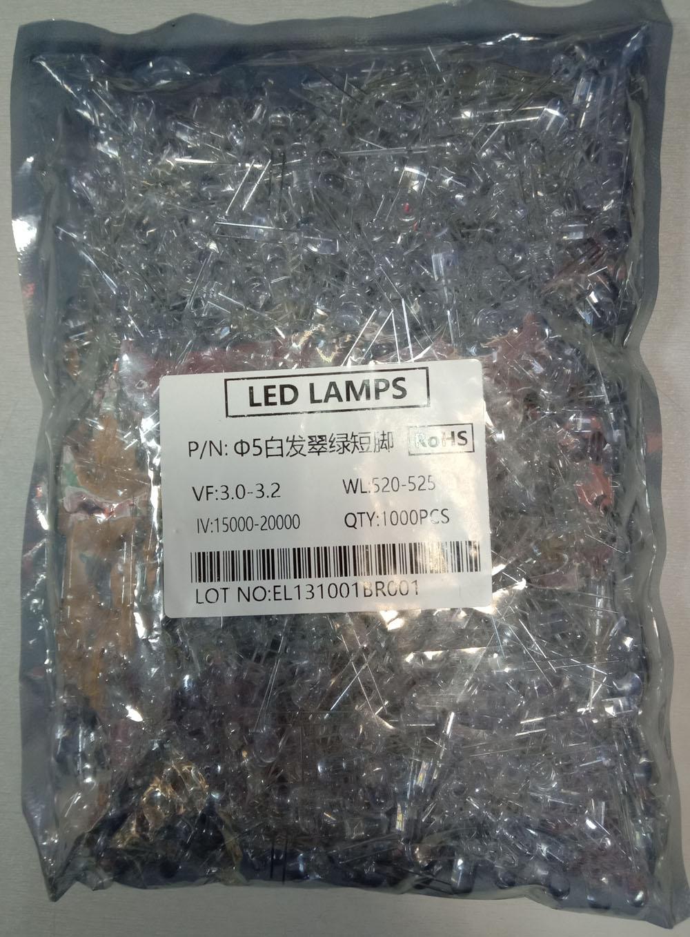 Светодиоды > светодиод диам 5мм зелёный прозрачный 5AG4XC DFL5013PGC-20 520nm 20канд цена за 1шт при количестве 1000шт