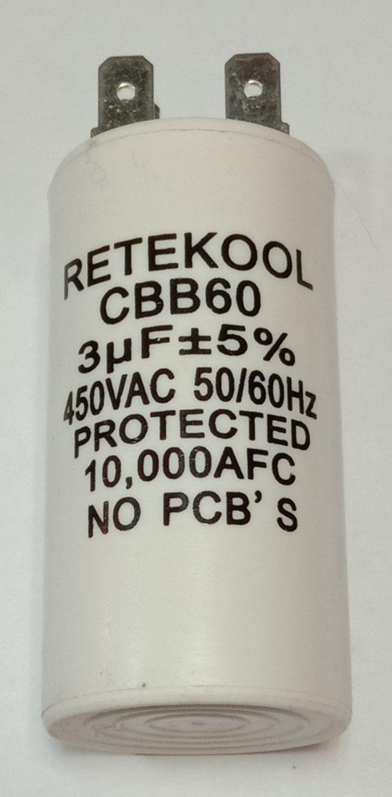 Конденсаторы пусковые CBB60 в цилиндрическом корпусе > конденсатор пусковой 3uF 450V 85C 50/60Hz клеммы 30x60mm Retekool CBB60
